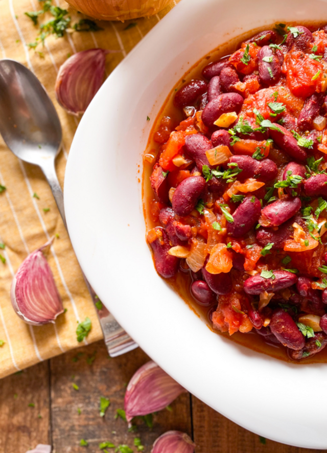 A bold, tasty and hearty dish paired with basmati rice with cumin seeds and peas. Garlic, Onion, Kidney Beans, Tomatos and spices! yum :)
